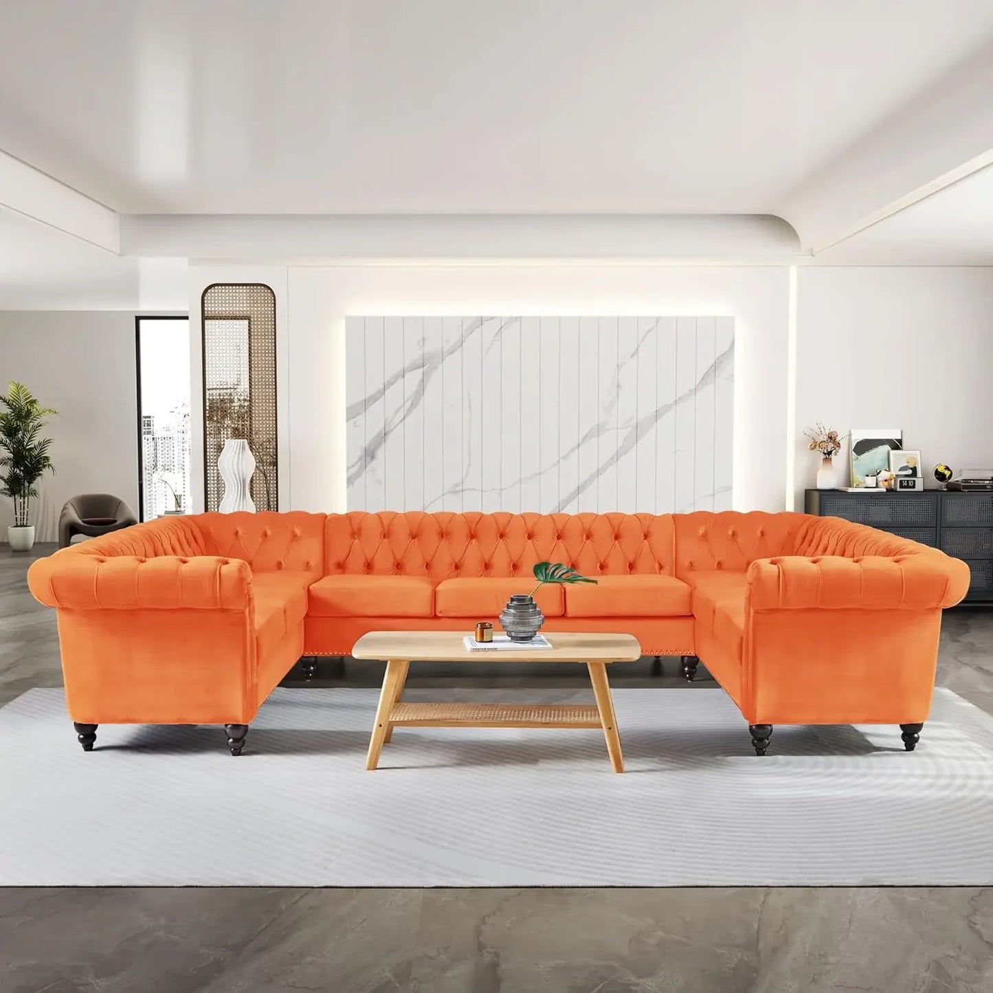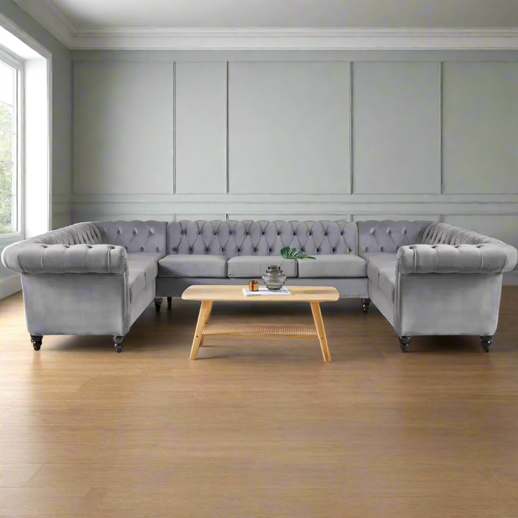 Luxury, comfort, and elegance—all in one! The ArtZ® Luxe Sofa is designed to bring style and spacious seating to your home. Upholstered in premium faux leather, or velvet, this 9-seater tufted sofa features rolled armrests, intricate nailhead detailing, and deep cushioning for the perfect blend of sophistication and coziness. Whether you're hosting guests or lounging with family, this statement piece offers plush comfort and timeless charm to elevate your living space. Perfect for large gatherings, movie nights, or simply stretching out in style!