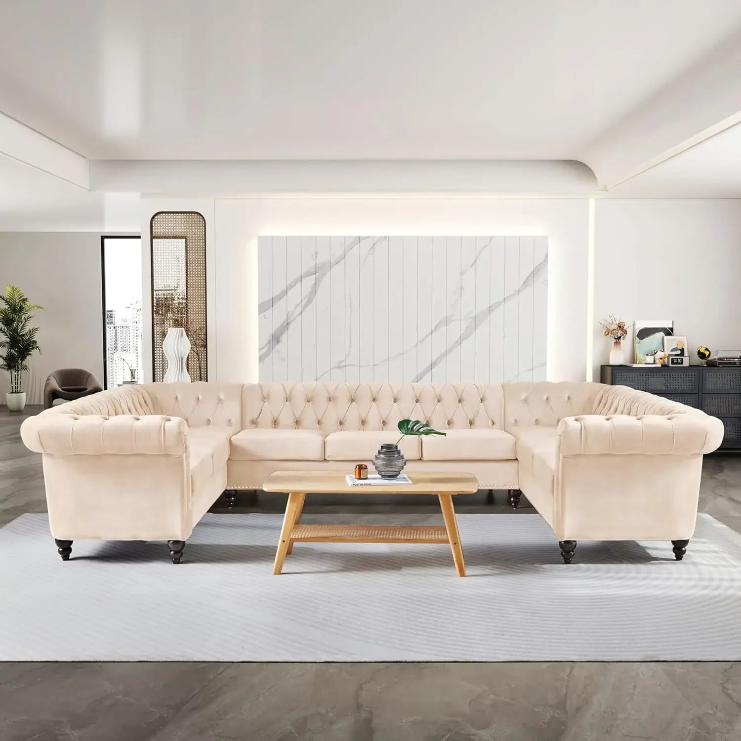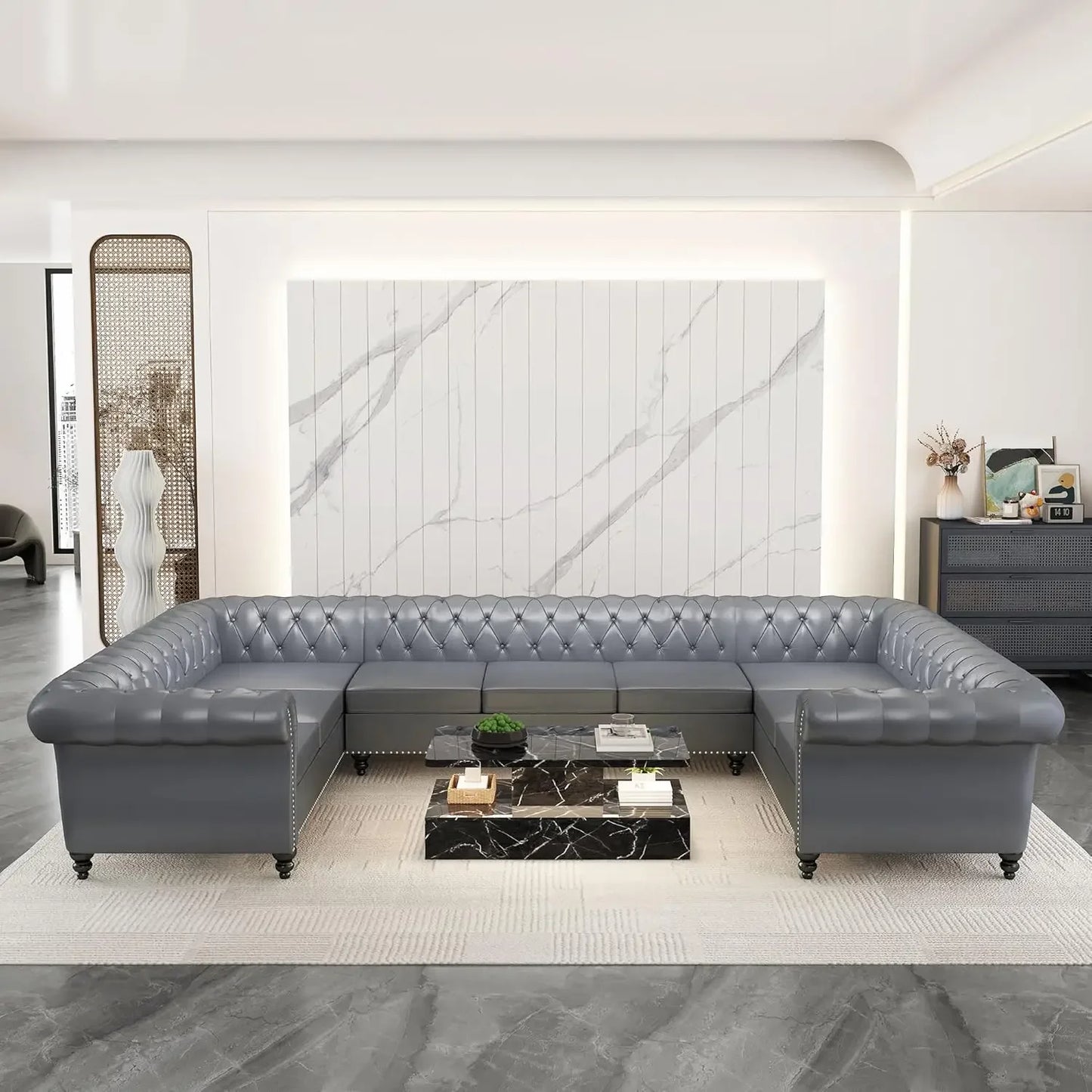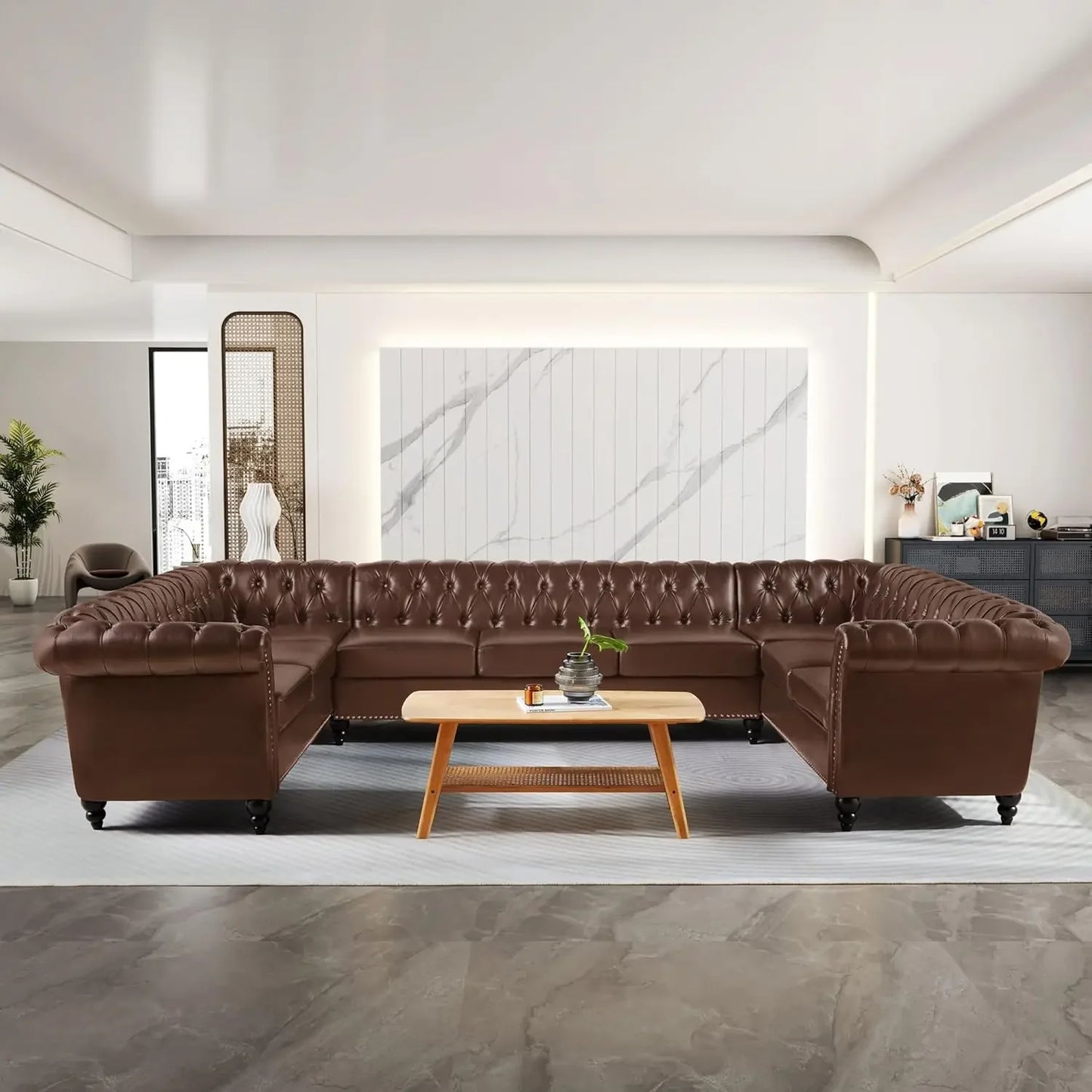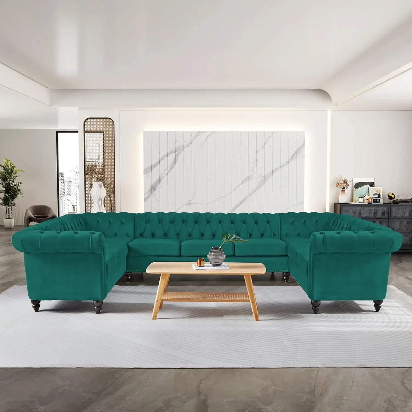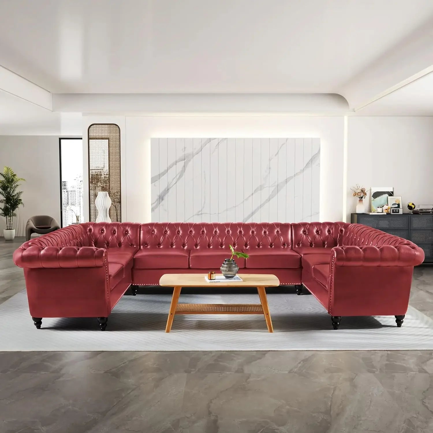 Luxury, comfort, and elegance—all in one! The ArtZ® Luxe Sofa is designed to bring style and spacious seating to your home. Upholstered in premium faux leather, or velvet, this 9-seater tufted sofa features rolled armrests, intricate nailhead detailing, and deep cushioning for the perfect blend of sophistication and coziness. Whether you're hosting guests or lounging with family, this statement piece offers plush comfort and timeless charm to elevate your living space. Perfect for large gatherings, movie nights, or simply stretching out in style!