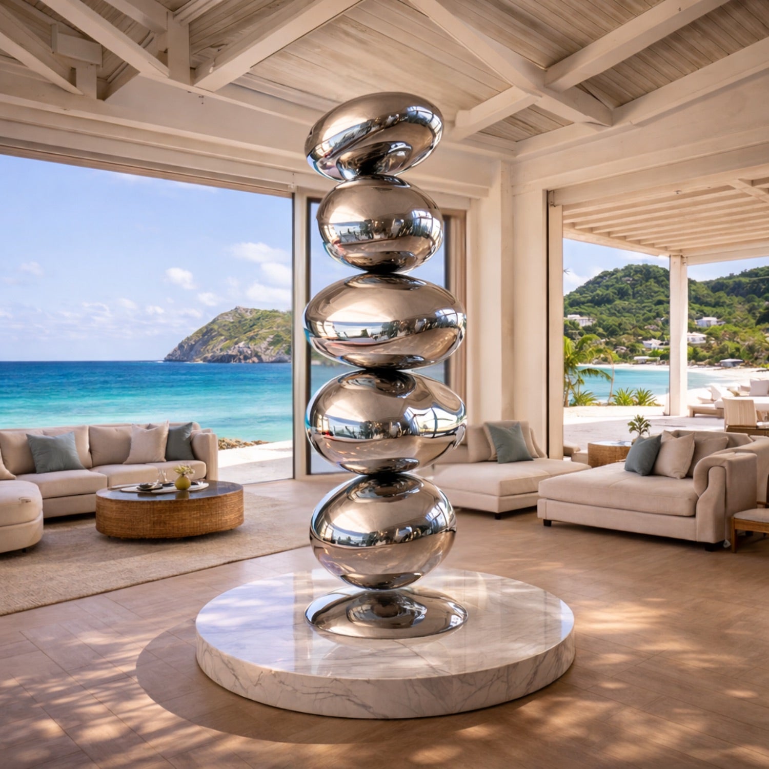 The OSO Stainless Steel Floating Pebbles Sculpture is a refined expression of harmony and balance, inspired by the organic beauty of naturally stacked stones. Composed of a vertical sequence of smooth, mirror-polished forms, the sculpture evokes the calming presence of pebbles seemingly suspended in perfect equilibrium.